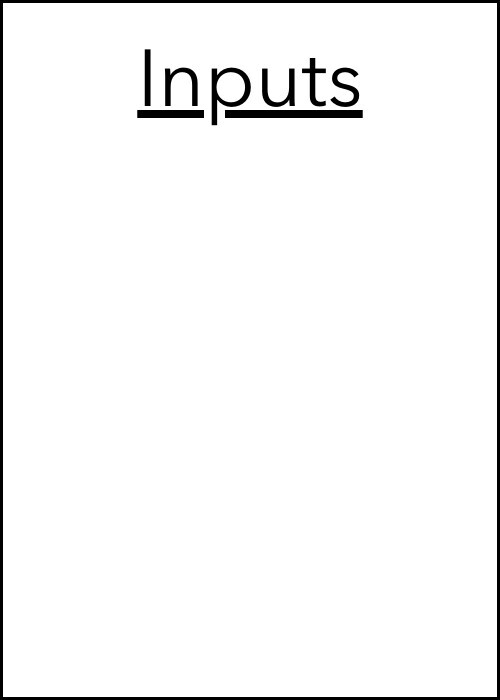 A logic model also identifies ingredients but calls them inputs. For the scenario involving income assistance for our stressed kin caregivers, the inputs might include money, staff (to administer the program), materials (for applications), and so on.